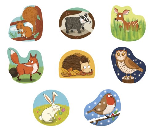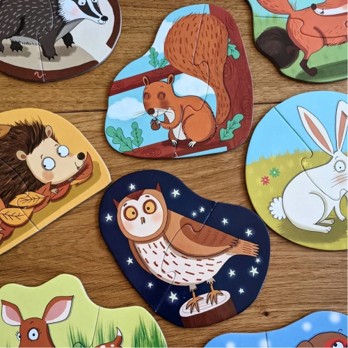 Balení obsahuje 8 puzzle lesních zvířátek z pevného kartonu, každé se skládá ze 2 dílků.