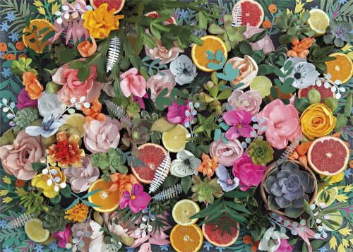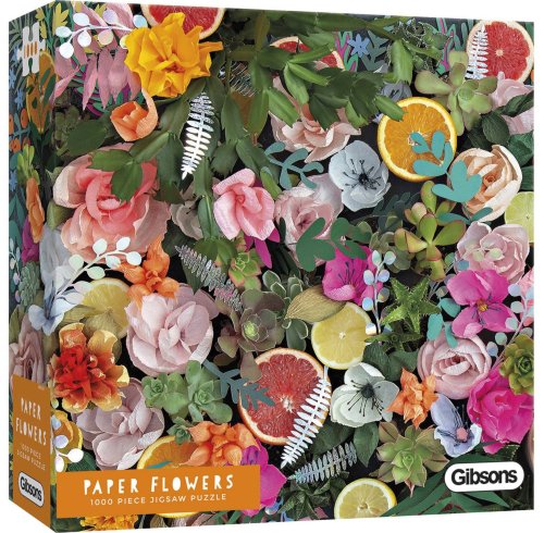 Puzzle s motivem papírových květin Rachel Emmy Waring od anglického výrobce GIBSONS. Rozměr složeného puzzle cca 68 x 49 cm