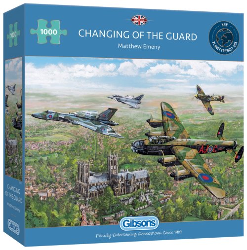 Tato čtyři letadla přelétají nad Lincolnovou katedrálou a zdůrazňují význam minulé i současné britské protivzdušné obrany. Lancaster a Spitfire jsou zobrazeni odtrhnutí od formace, aby symbolizovali staré hrdiny, kteří se pohybují stranou a uvolnilňují cestu Vulcanovi a současnému bojovníkovi Typhoonovi, zatímco RAF pokračují ve svém příběhu. Puzzle od anglického výrobce GIBSONS. Rozměr složeného puzzle cca 68 x 49 cm
