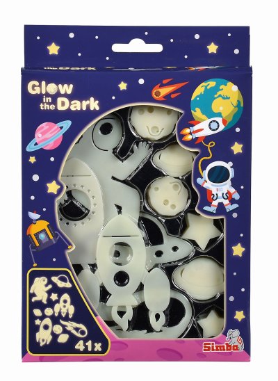 Sada fluorescenčních hvězdiček, astronauta, vesmírné lodi a dalších motivů, které po nasvícení ve tmě svítí. Dekorace vhodná k nalepení na stěnu, strop či nábytek. Včetně lepicí gumy. Sada obsahuje 41 ks.