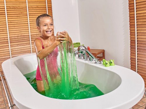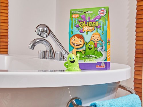 Prášek Glibbi přemění vodu do zeleného slizu a zábavné koupání může začít, poté stačí jen doplnit vodu a vytáhnout špunt.