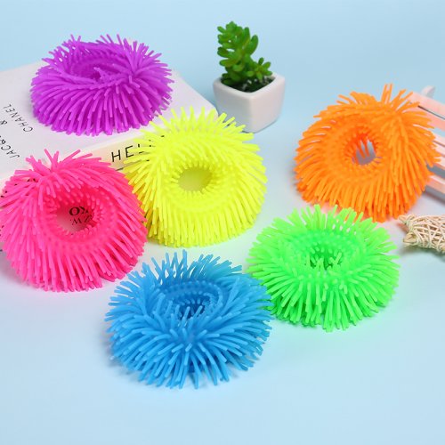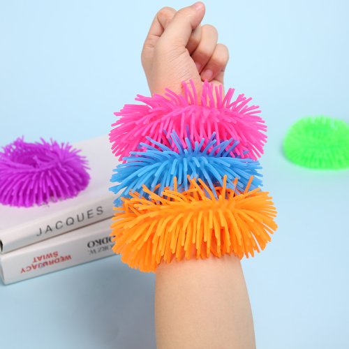 Je vyroben z měkkého a pružného gumového materiálu, který je bezpečný pro děti a příjemný na nošení. Náramek má střapatý design s různobarevnými výčnělky, které se dají mačkat a natahovat, což dětem poskytuje smyslovou stimulaci a pomáhá jim soustředit se a uklidnit.