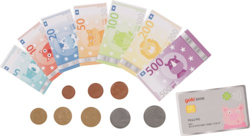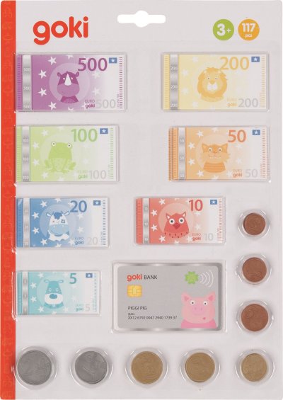 Rozměry bankovek: max 8 x 4 cm, min 6 x 3,2 cm. Rozměry mincí: Ø 1,5 - 2,6 cm. Rozměry kreditní karty: 8 x 5 cm. Balení obsahuje: 117 ks mincí a bankovek včetně kreditní karty (8 druhů euro mincí po 4 ks, 7 druhů bankovek). GOKI patří mezi nejvýznamnější evropské výrobce hraček s vysokou pedagogickou a didaktickou kvalitou. Firma klade důraz na bezpečnost hraček, jejich zdravotní nezávadnost a dbá na obnovitelné zdroje. Dřevo je bráno tam, kde může dorůstat. Používané dřeviny jsou javor, buk, ořech, lípa, jasan, borovice, bříza a gumovník. Barvy a laky pocházejí od menších výrobců.