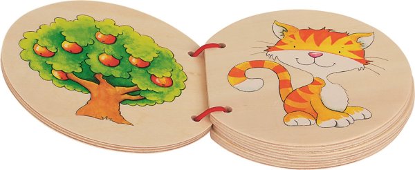 Obrázková knížečka pro nejmenší je vyrobena ze dřeva. Na 4 dřevěných listech najdeme osm různých obrázků. Rozměr: 10 x 9,2 x 2,1 cm.