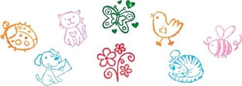 Dřevěná razítka s láskyplně navrženými zvířátky: beruška, včelka, květina, pes, motýl, kočka, spící kočka a pták.