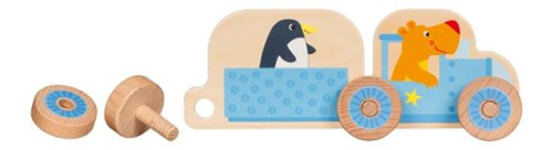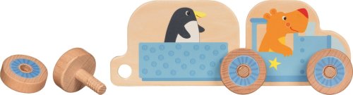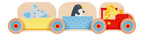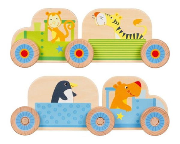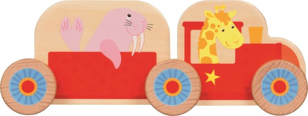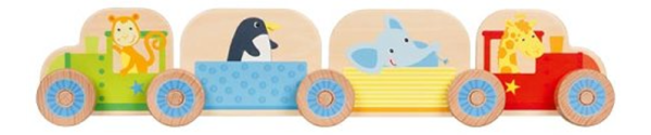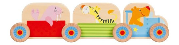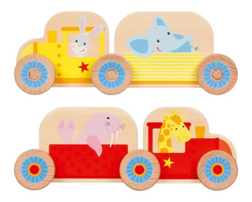 Sestavte si svůj první vláček! Má dvě lokomotivy a dva vagónky a veze zvířátka z dalekých zemí, které k nám jedou na výlet.