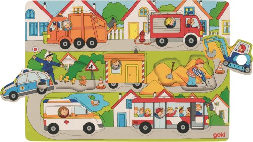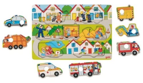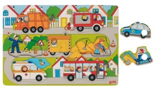 Jednotlivé dílky s obrázky mají kulaté výřezy pro lepší vyjmutí a v nich je vidět obrázek, který se po vyjmutí dílků objeví celý. Je zaručeno, že zvídavost dětí nenechá dospěláky na pokoji. Je třeba objevovat a povídat si o tom, co se děje na cestách. Podporuje rozvoj koordinace oko-ruka, logického myšlení a představivosti, obrázková dřevěná podložka usnadňuje skládání a rámečky zabezpečují, aby jednotlivá dřevěná vozidla držela na svých místech.