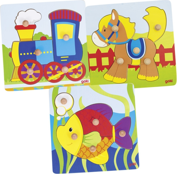 Jednotlivé dílky s obrázky mají úchytky. Podporuje rozvoj koordinace oko-ruka, logického myšlení a představivosti. Dřevěná podložka s vyřezaným obrysem skládaného obrázku zabezpečí, aby poskládaný obrázek držel na svém místě.