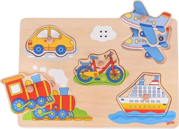 Dřevěné zvukové puzzle s obrázky dopravních prostředků.