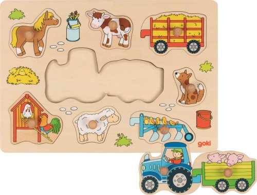 Barevná dětská vkládačka s devíti dílky s motivem farmy. Výhody: