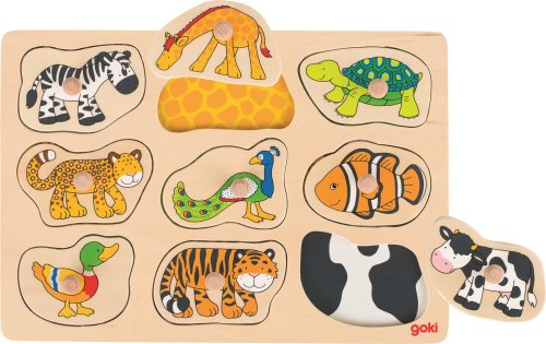 rozvoj koordinace oko-ruka, logického myšlení a představivosti, dřevěná podložka usnadňuje skládání a rámečky zabezpečují, aby jednotlivá dřevěná zvířátka držela na svých místech, každé zvířátko má podkladový obrázek, dřevěné úchytky pro snazší manipulaci.