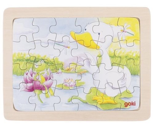 Dětské puzzle ze dřeva. Dílky jsou umístěny na dřevěné desce s vyfrézovaným obrysem pro usnadnění skládání. Skládání puzzle rozvíjí fantazii a podporuje rozvoj motoriky. Doporučeno pro děti od 3 let. GOKI patří mezi nejvýznamnější evropské výrobce hraček s vysokou pedagogickou a didaktickou kvalitou. Firma klade důraz na bezpečnost hraček, jejich zdravotní nezávadnost a dbá na obnovitelné zdroje. Dřevo je bráno tam, kde může dorůstat. Používané dřeviny jsou javor, buk, ořech, lípa, jasan, borovice, bříza a gumovník. Barvy a laky pocházejí od menších výrobců. Rozměr složeného puzzle cca 16,5 x 12 cm