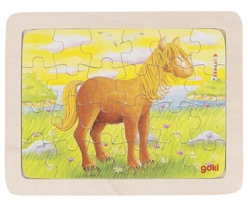 Dětské puzzle ze dřeva. Dílky jsou umístěny na dřevěné desce s vyfrézovaným obrysem pro usnadnění skládání. Skládání puzzle rozvíjí fantazii a podporuje rozvoj motoriky. Doporučeno pro děti od 3 let. GOKI patří mezi nejvýznamnější evropské výrobce hraček s vysokou pedagogickou a didaktickou kvalitou. Firma klade důraz na bezpečnost hraček, jejich zdravotní nezávadnost a dbá na obnovitelné zdroje. Dřevo je bráno tam, kde může dorůstat. Používané dřeviny jsou javor, buk, ořech, lípa, jasan, borovice, bříza a gumovník. Barvy a laky pocházejí od menších výrobců. Rozměr složeného puzzle cca 16,5 x 12 cm