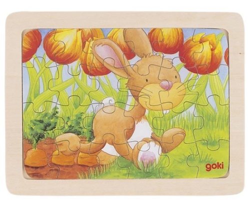 Dětské puzzle ze dřeva. Dílky jsou umístěny na dřevěné desce s vyfrézovaným obrysem pro usnadnění skládání. Skládání puzzle rozvíjí fantazii a podporuje rozvoj motoriky. Doporučeno pro děti od 3 let. GOKI patří mezi nejvýznamnější evropské výrobce hraček s vysokou pedagogickou a didaktickou kvalitou. Firma klade důraz na bezpečnost hraček, jejich zdravotní nezávadnost a dbá na obnovitelné zdroje. Dřevo je bráno tam, kde může dorůstat. Používané dřeviny jsou javor, buk, ořech, lípa, jasan, borovice, bříza a gumovník. Barvy a laky pocházejí od menších výrobců. Rozměr složeného puzzle cca 16,5 x 12 cm