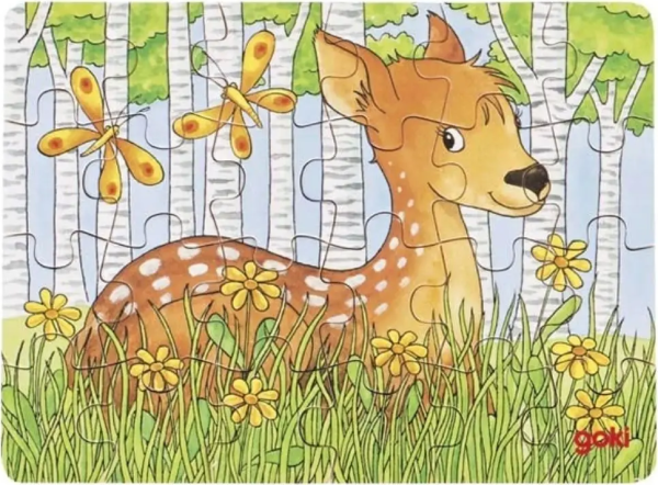 Dětské puzzle ze dřeva s motivem obyvatel lesa. Skládání puzzle rozvíjí fantazii a podporuje rozvoj motoriky. Doporučeno pro děti od 4 let. GOKI patří mezi nejvýznamnější evropské výrobce hraček s vysokou pedagogickou a didaktickou kvalitou. Firma klade důraz na bezpečnost hraček, jejich zdravotní nezávadnost a dbá na obnovitelné zdroje. Dřevo je bráno tam, kde může dorůstat. Používané dřeviny jsou javor, buk, ořech, lípa, jasan, borovice, bříza a gumovník. Barvy a laky pocházejí od menších výrobců. Rozměr složeného puzzle cca 17 x 12 cm