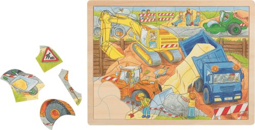 Dětské puzzle ze dřeva s motivem rušné scény na staveništi. Dílky jsou umístěny na dřevěné desce s vyfrézovaným obrysem pro usnadnění skládání. Puzzle nemá standardní tvar dílků jak je známe z klasického skládání, ale obrázek je složen z částí nepravidelného tvaru bez zámků, jakoby jej někdo rozpraskal. Skládání puzzle rozvíjí fantazii a podporuje rozvoj motoriky. Doporučeno pro děti od 3 let. GOKI patří mezi nejvýznamnější evropské výrobce hraček s vysokou pedagogickou a didaktickou kvalitou. Firma klade důraz na bezpečnost hraček, jejich zdravotní nezávadnost a dbá na obnovitelné zdroje. Dřevo je bráno tam, kde může dorůstat. Používané dřeviny jsou javor, buk, ořech, lípa, jasan, borovice, bříza a gumovník. Barvy a laky pocházejí od menších výrobců. Rozměr složeného puzzle cca 38 x 28 cm
