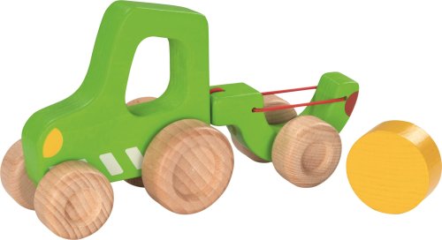 Dřevěný traktor s vlečkou s otvorem pro snadné uchopení, použité barvy jsou zdravotně nezávadné, rozměr: 21 x 11,3 x 6,4 cm