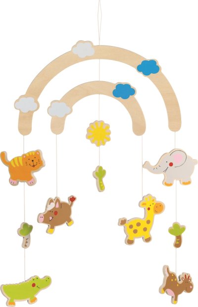 Dřevěný závěsný kolotoč do dětského pokoje s veselými kamarády z divočiny . Rozměr: 39 x 32 x 44 cm.