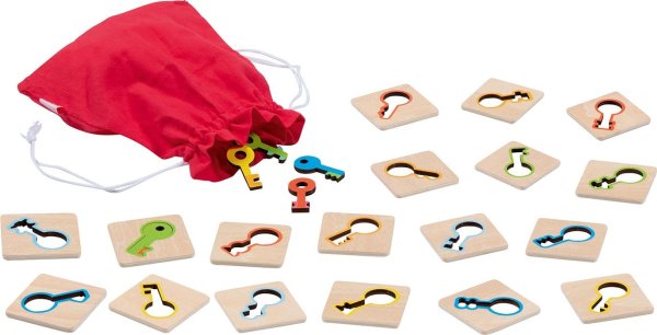 Balení obsahuje : bavlněný pytlík, 16 ks klíčů a 16 ks destiček 5x5cm, návod. GOKI patří mezi nejvýznamnější evropské výrobce hraček s vysokou pedagogickou a didaktickou kvalitou. Firma klade důraz na bezpečnost hraček, jejich zdravotní nezávadnost a dbá na obnovitelné zdroje. Dřevo je bráno tam, kde může dorůstat. Používané dřeviny jsou javor, buk, ořech, lípa, jasan, borovice, bříza a gumovník. Barvy a laky pocházejí od menších výrobců.