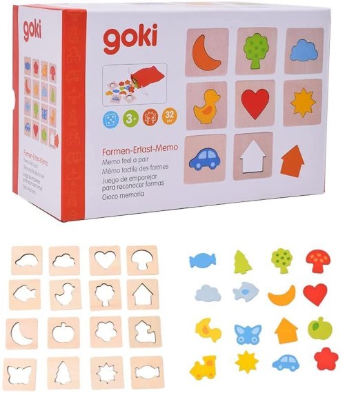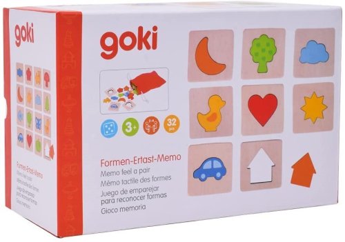 Balení obsahuje: bavlněný pytlík, 32 ks hracích dílků, návod. Hra je vhodná pro zrakově postižené. GOKI patří mezi nejvýznamnější evropské výrobce hraček s vysokou pedagogickou a didaktickou kvalitou. Firma klade důraz na bezpečnost hraček, jejich zdravotní nezávadnost a dbá na obnovitelné zdroje. Dřevo je bráno tam, kde může dorůstat. Používané dřeviny jsou javor, buk, ořech, lípa, jasan, borovice, bříza a gumovník. Barvy a laky pocházejí od menších výrobců.