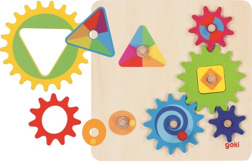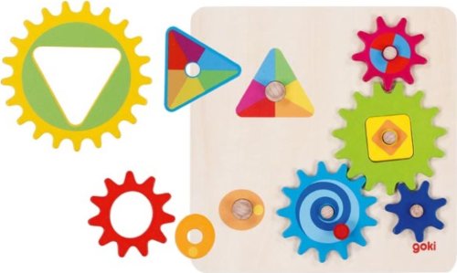 Skládání barevných dřevěných ozubených kol na podložku je jen polovina zábavy. Teprve po umístění modrého kola se ukáže zda plán vyšel - otáčí se všechna kola? A kterým směrem se otáčejí?