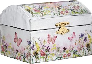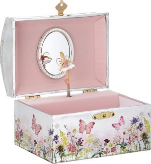 Šperkovnice ve stylu hrací skříňky potěší malé dámy, které touží uložit své šperky jak se patří. Po otevření skříňky začne hrát jemná melodie z opery Labutí jezero a malá baletka se roztančí před svým zrcadlem. Skříňka je provedena ve stříbrné barvě s leskem a s jemnými květinovými dekoracemi. Rozměry skříňky: 15 x 10,5 x 10,7 cm. Upozornění: Výrobek není hračka, jedná se o dekorativní předmět. GOKI patří mezi nejvýznamnější evropské výrobce hraček s vysokou pedagogickou a didaktickou kvalitou. Firma klade důraz na bezpečnost hraček, jejich zdravotní nezávadnost a dbá na obnovitelné zdroje. Dřevo je bráno tam, kde může dorůstat. Používané dřeviny jsou javor, buk, ořech, lípa, jasan, borovice, bříza a gumovník. Barvy a laky pocházejí od menších výrobců.