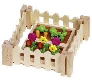 Komplet pro malé zahradníky obsahuje 32 doplňků z masivního dřeva. Hodí se k domečkům pro panenky nebo pro samostatné hraní. Na dvou záhonech (7,7 x 5 x 1,8 cm) lze pěstovat zeleninu, ohradit je malým plotem a nechybí ani potřebné nářadí, semínka a sazenice. Set pro zahradničení podporuje fantazii a je inspirující a vzdělávací hračkou.