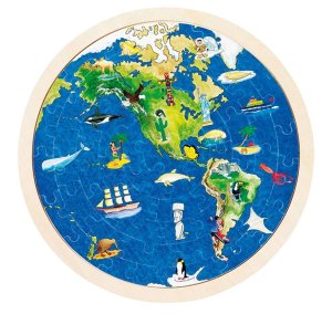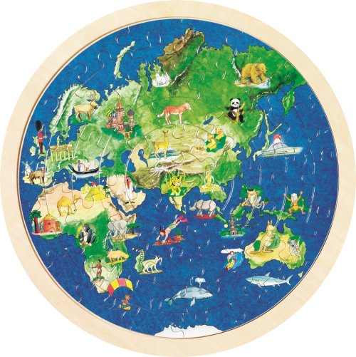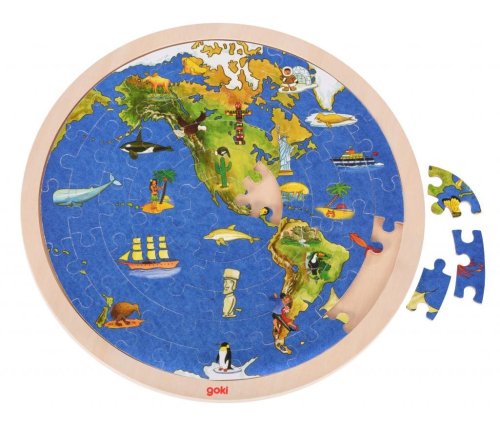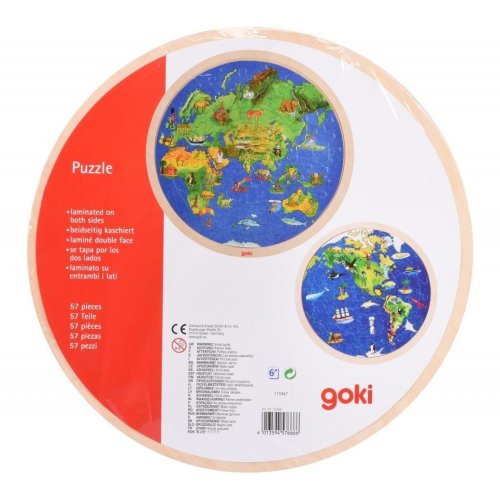 Oboustranné puzzle ze dřeva s mapou světa. Na každé straně je jedna polokoule. Dílky jsou umístěny na dřevěné desce s vyfrézovaným okrajem pro usnadnění skládání. Skládání puzzle rozvíjí fantazii a podporuje rozvoj motoriky. GOKI patří mezi nejvýznamnější evropské výrobce hraček s vysokou pedagogickou a didaktickou kvalitou. Firma klade důraz na bezpečnost hraček, jejich zdravotní nezávadnost a dbá na obnovitelné zdroje. Dřevo je bráno tam, kde může dorůstat. Používané dřeviny jsou javor, buk, ořech, lípa, jasan, borovice, bříza a gumovník. Barvy a laky pocházejí od menších výrobců. Rozměr složeného puzzle cca 30 x 30 cm