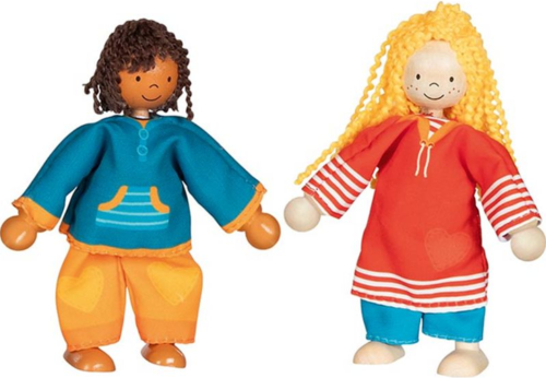 Dřevěné panenky jsou pohyblivé, mohou sedět, stát nebo ležet. Hodí se do domečků nebo pro samostatné hraní. Vhodné do všech domečků pro panenky značky Goki. Použitý materiál: dřevo, drát, různé druhy textilií. Výška panenek: 10 cm. Balení obsahuje: dřevěnou krabičku, 2 ks flexibilních postaviček (Fynja a Fabio) a 8 sad oděvů.