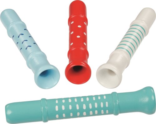 Dřevěná píšťalka v pastelových barvách s jemným vzorkem, vydává vyšší pískavý zvuk známý např. z poutí, veselé pískání rozvíjí zájem o hudbu a procvičuje smyslové vjemy, rozměry: délka 12 cm, max Ø 2 cm.