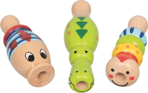 Barevná dřevěná píšťalka - krokodýl, rybička, housenka, veselé pískání rozvíjí zájem o hudbu a procvičuje smyslové vjemy, rozměry: délka 8 - 10 cm, max Ø 3 cm.