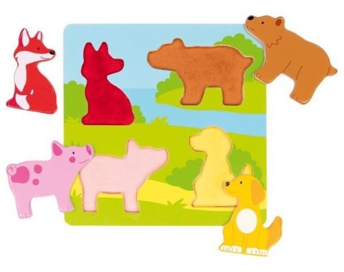 Dřevěná vkládačka s ukázkou srsti nebo kůže zvířátek. Čtyři vkládací obrázky s motivy zvířátek pod sebou ukrývají nevšední zážitek. Vkládačka má ve vyfrézovaných otvorech ukázku pokožky vyobrazených zvířátek. Jak hebký kožíšek má liška a jaké je na omak prasátko? Dítě se podle tvarů snaží najít správný obrázek (rozvoj představivosti a logického myšlení), a umístit jej do správného otvoru (rozvoj jemné motoriky). Jednotlivé vkládací dílky mohou sloužit i jako hrací figurky, pro které mohou děti vymýšlet vlastní příběhy. Doporučeno pro děti od 1 roku.