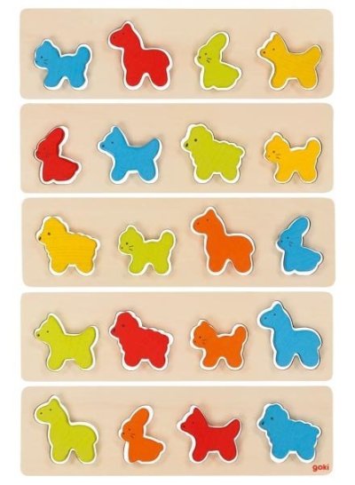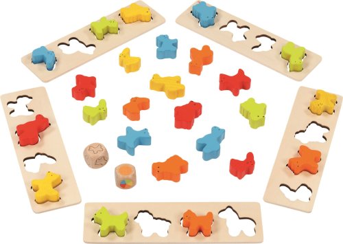 5 hracích destiček z přírodního dřeva (24 x 7 x 0,5 cm), 25 barevných zvířátek + 2 hrací kostky. Nejprve se děti mohou naučit vkládat barevné zvířátka do výřezů podle tvarů a cvičit prstíky a jemnou motoriku. Postupně se naučí rozlišovat barvy a doplňovat zvířátka podle barev. Při hře s kostkou hráči doplňují zvířátka podle druhu a barvy, která padne.
