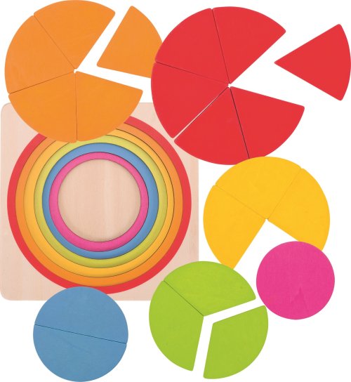 Podporuje rozvoj jemné motoriky, poznávání barev, podkladová deska s pevným okrajem slouží jako podložka pro skládání, jednotlivé vrstvy jsou vyfrézované, barva kružnice odpovídá barvě skládaného kruhu, výborná didaktická pomůcka pro výuku dělení.