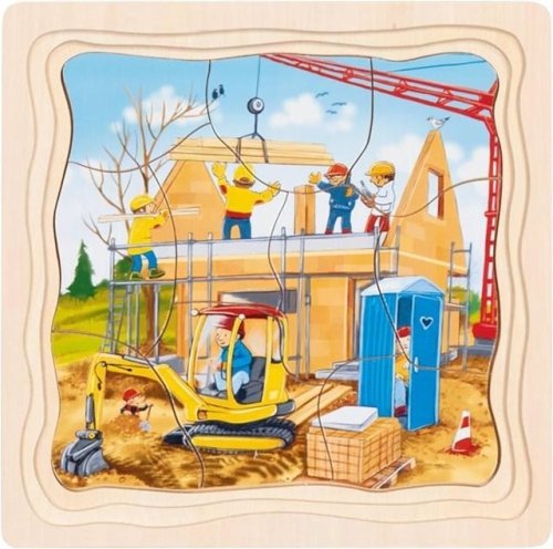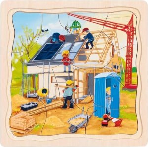 rozvoj jemné motoriky, podkladová deska s pevným okrajem slouží jako podložka pro skládání, každá vrstva skládačky zobrazuje jednu fázi stavby domu, jednotlivé vrstvy jsou různě vyfrézované (do každého patra pasuje pouze jeden z obrázků), obrázky lze skládat samostatně bez podkladové desky.