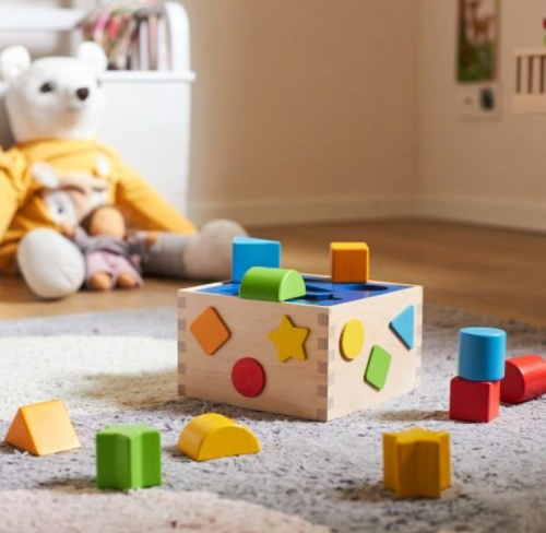 Dřevěná krabička s otevíracím víkem na třídění barevných tvarů je ideální pro nejmenší děti a jejich počáteční zkoumání otvorů a tvarů.