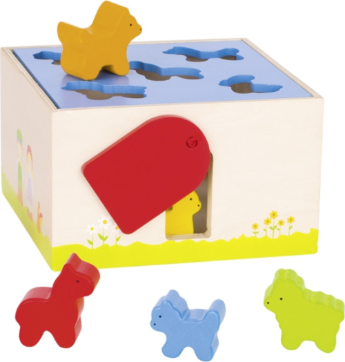 Dřevěná krabička s otevíracím víkem na třídění barevných tvarů je ideální pro nejmenší děti a jejich počáteční zkoumání otvorů a tvarů.