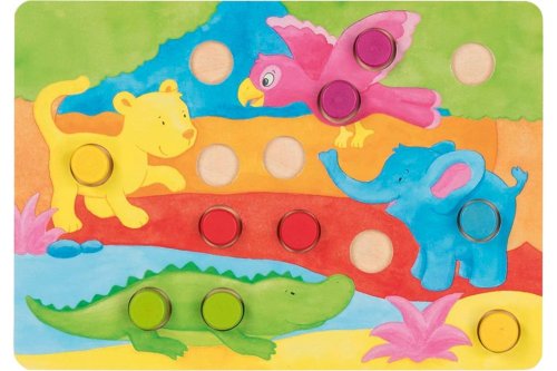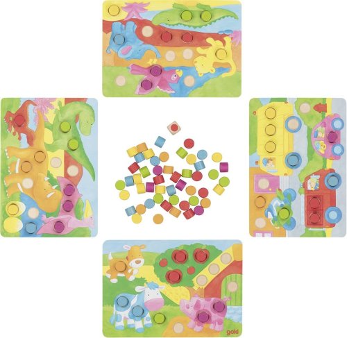 4 barevné dřevěné obrázky (21 x 14,5 x 0,6 cm), 90 barevných kamenů + barevná hrací kostka. Nejprve se děti mohou naučit vkládat barevné kameny do obrázků dle vlastního potěšení a cvičit prstíky a jemnou motoriku. Postupně se naučí rozlišovat barvy a doplňovat kameny do obrázků podle barev. Při hře s kostkou hráči doplňují kameny podle barvy, která padne.