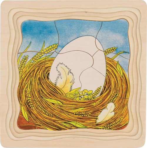 Seznam se s vývojem slepice. Nová forma edukativní zábavy. Vývojové puzzle je nejen nevšední dřevěnou hračkou, ale i výbornou učební pomůckou. Puzzle se skládá ze čtyř obrázků, z nichž každý zobrazuje jedno vývojové stádium slepičky. Každá vrstva má jiný obrázek a odlišný počet dílků. Vícevrstvé dřevěné puzzle je umístěné v desce (jednotlivé vrstvy různě vyfrézované) s pevným okrajem, která slouží zároveň jako podložka pro skládání. Skládání puzzle rozvíjí fantazii, učí děti zábavnou formou základy přírodovědy a podporuje rozvoj motoriky. Doporučeno pro děti od 3 let. GOKI patří mezi nejvýznamnější evropské výrobce hraček s vysokou pedagogicku a didaktickou kvalitou. Firma klade důraz na bezpečnost hraček, jejich zdravotní nezávadnost a dbá na obnovitelné zdroje. Dřevo je bráno tam, kde může dorůstat. Používané dřeviny jsou javor, buk, ořech, lípa, jasan, borovice, bříza a gumovník. Barvy a laky pocházejí od menších výrobců.