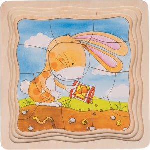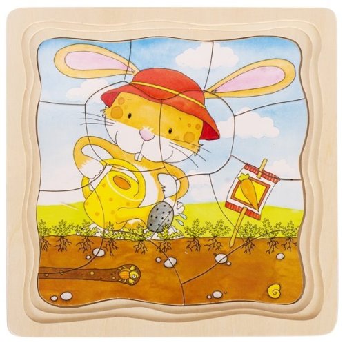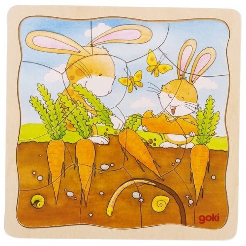 Seznam se s vývojovým stádiem oblíbené zeleniny - mrkve. Nová forma edukativní zábavy. Vývojové puzzle je nejen nevšední dřevěnou hračkou, ale i výbornou učební pomůckou. Puzzle se skládá ze čtyř obrázků, z nichž každý zobrazuje jednu fázi vývoje mrkve. Každá vrstva má jiný obrázek a odlišný počet dílků. Vícevrstvé dřevěné puzzle je umístěné v desce (jednotlivé vrstvy různě vyfrézované) s pevným okrajem, která slouží zároveň jako podložka pro skládání. Skládání puzzle rozvíjí fantazii, učí děti zábavnou formou základy přírodovědy a podporuje rozvoj motoriky. Doporučeno pro děti od 3 let. GOKI patří mezi nejvýznamnější evropské výrobce hraček s vysokou pedagogickou a didaktickou kvalitou. Firma klade důraz na bezpečnost hraček, jejich zdravotní nezávadnost a dbá na obnovitelné zdroje. Dřevo je bráno tam, kde může dorůstat. Používané dřeviny jsou javor, buk, ořech, lípa, jasan, borovice, bříza a gumovník. Barvy a laky pocházejí od menších výrobců.