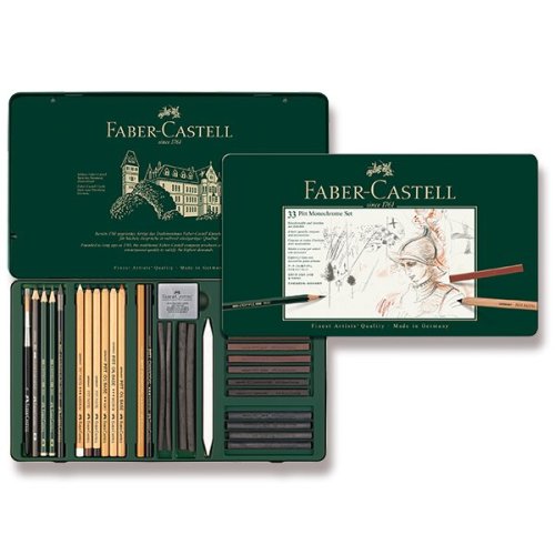 Sada 33 ks., SLOŽENÍ:, * grafitové tužky Castell 9000, * grafitové tužky Pitt Monochrome, * pastely Pitt, * pastely Pitt Monochrome, * uhly Pitt Monochrome, * umělecké pryže, * doplňky, Monochromatické barvy černé, bílé, sanguine a sépiové najdete v hodinách kreslení na téměř každé umělecké škole. Oživují obrázky vitalitou a výrazem. Jedná se o starou tradici, figurální kresby, která sahá až do renesance, doplněná bílou barvou a stíny prohloubenými černou barvou. Monochromní pastelky Faber-Castell Pitt se vracejí k této dlouhé tradici, kreslení postav, a proto jsou pastelky určené pro skicování tvrdší než běžné pastelové pastelky. Z tohoto důvodu čáry při rozmazání úplně nezmizí. Součástí sady jsou, bezolejové a olejové kreslicí tužky pro skicování a detaily., TIP: Ke kreslení můžete potřebovat i umělecké papíry na suché výtvarné techniky a vázané skicáře