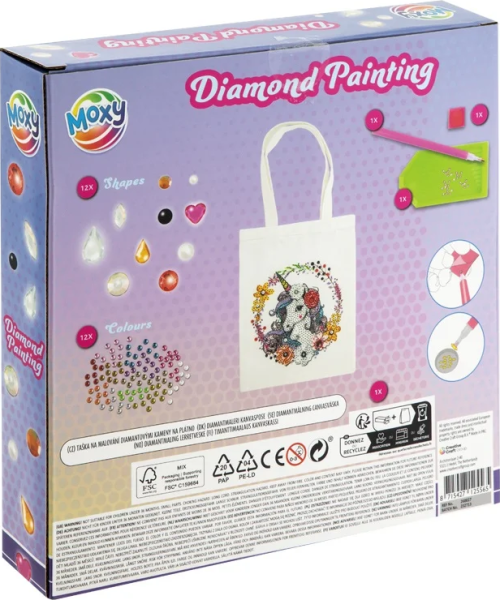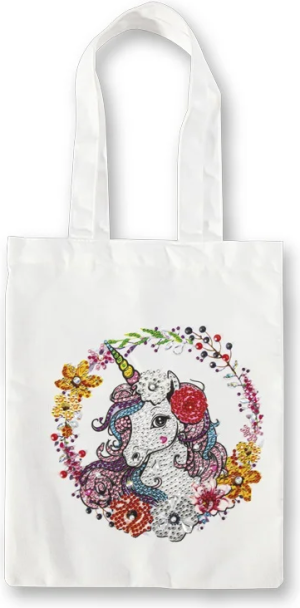 Sada pro dotvoření tašky s obrázkem jednorožce ozdobeného diamantovými kamínky. Diamantové malování je nejen skvělý způsob relaxace, ale také zábava pro všechny bez ohledu na věk.