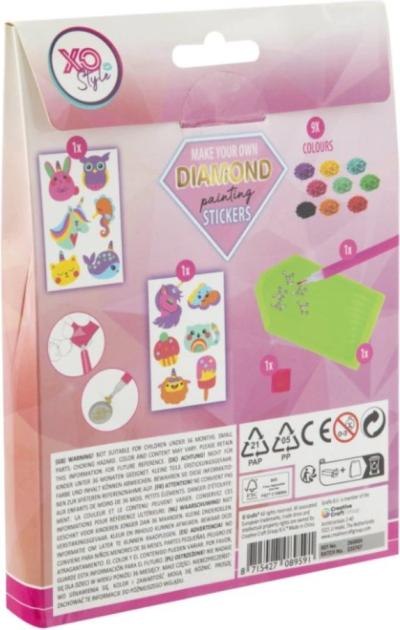 Balení obsahuje: barevné kamínky, aplikátor, misku, vosk a 12 ks samolepek. Diamantové malování - postup: Horní strana samolepek je potažena lepidlem a překrytá průhlednou folií. Kamínky požadované barvy vysypejte do misky. Do hrotu pera naberte vosk, díky kterému se kamínky snadno přichytí na pero, a nanášejte na obrázek.