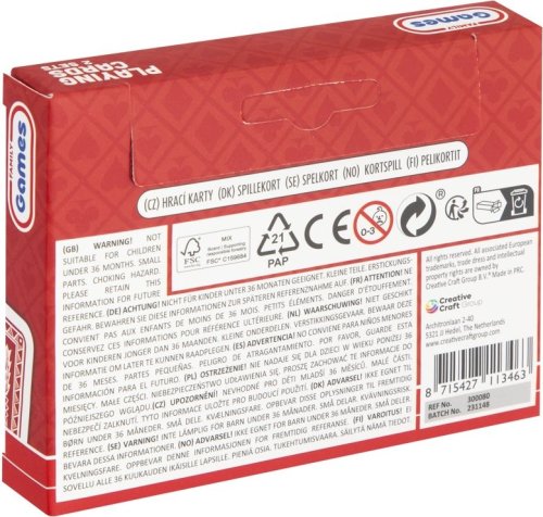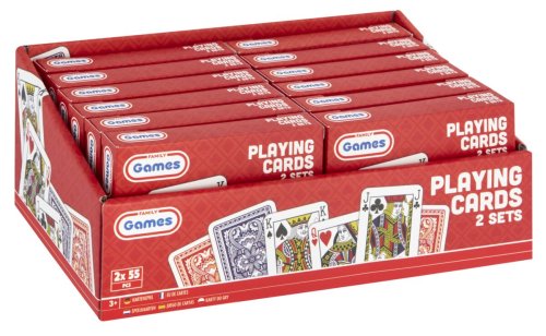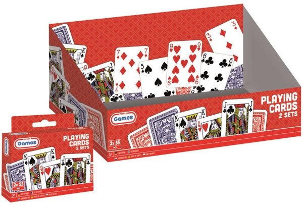 Klasické karty francouzského typu vhodné pro hraní kanasty, žolíka, bridže, pokeru nebo pasiánsu. Balení obsahuje 2 x 55 hracích karet. Velikost jedné karty je cca 8,5 x 5,5 cm.