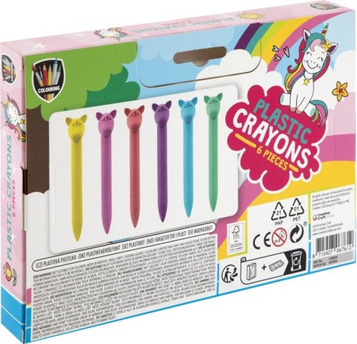 konec voskovky má tvar hlavy roztomilého jednorožce balení obsahuje 6 různých pastelových barev délka voskovky je cca 11 cm průměr voskovky (měřeno ve středu) je cca 1 cm
