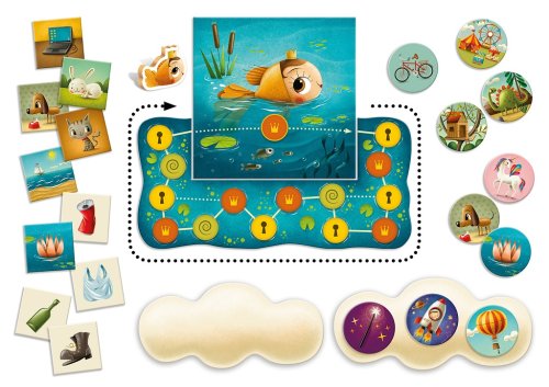 Hra plná emocí, která rozvíjí dětskou vnímavost, trénuje paměť a pozornost a učí kreativnímu myšlení. Dalším edukativním prvkem je téma ekologie.V průběhu hry se hráči budou snažit, aby zlatá rybka splnila jejich přání. Hráči navíc pomáhají rybám tím, že čistí jezero od odpadků. Jak hrát?1. Hoďte kostkou a posuňte zlatou rybku o tolik polí, kolik je házené číslo.2. Pokud přistanete na poli s korunou, vezměte si jeden žeton a uvidíte, jestli se vaše přání splní.3. Vyhrajete, když zlatá rybka splní všechna vaše přání. Hlavní vlastnosti: rozvíjí dětskou vnímavost trénuje paměť a pozornost návod