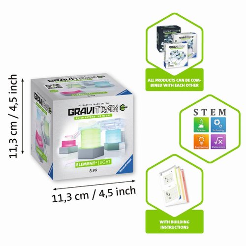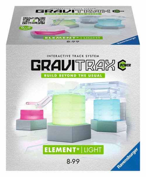 Parádní světelné efekty pro každou dráhu GraviTrax: s GraviTrax POWER Světelným prvkem to není problém! Celkem 3 světelné sloupce v kombinaci s transparentně strukturovanými výškovými kameny umožňují stavět světelné sloupy libovolně v různých výškách a zabudovat je do jakékoli dráhy GraviTrax. Hráč může navíc stisknutím tlačítka změnit barvu světla.