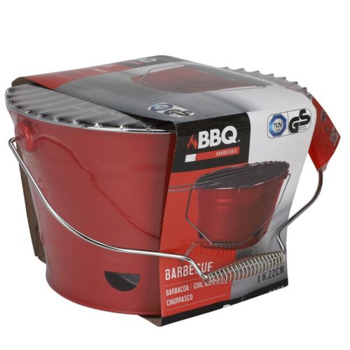kbelík na grilování s práškovým lakováním na 3 sklopných nožičkách s rukojetí, celková výška 22cm, horní část kbelíku o průměru 27xv17cm, spodní část o průměru 21cm, s chromovaným grilovacím stojanem. vnitřní zinkové vědro, horní průměr 205xh90mm, spodní průměr 155mm. barva matná červená