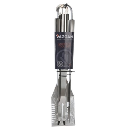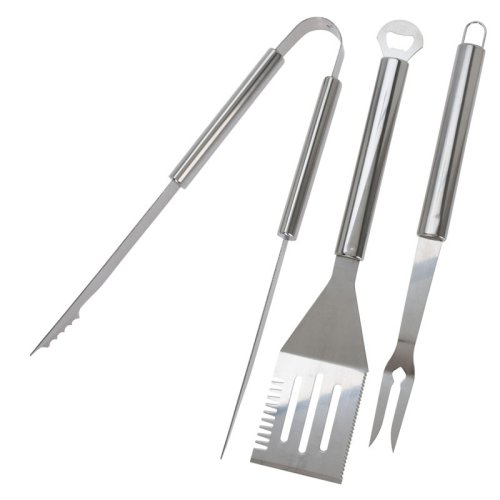 sada nářadí na grilování 3ks z nerezové oceli 18/0; 1 vidlice délka 455mm, tloušťka 1,8mm; 1 pár kleští délka 445mm, tloušťka 1,8mm (bez koženého řemínku); 1 obracečka s drážkou 475x90mm, tloušťka 1,5mm, hmotnost sady 732 gramů