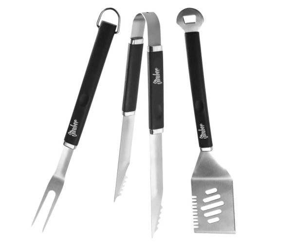 Sada 3 ks nerez grilovací nářadí s plastovou ochranou proti popálení. Sada obsahuje nerezové kleště, vidlice a obracečka s dřevěnou rukojetí. Obracečka má integrovaný otvírák na lahve, čistící strana na rošt a čepel na řez masa, zeleniny atd. EAN 4016002073054
